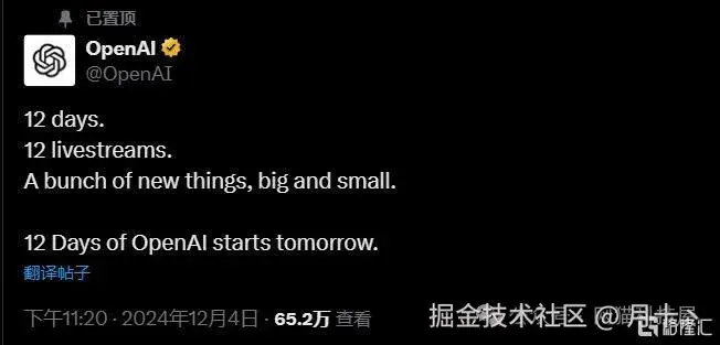 就在12月4日,OpenAI宣布将在未来的 12 天进行 12 场直播,每天发布最新AI技术。