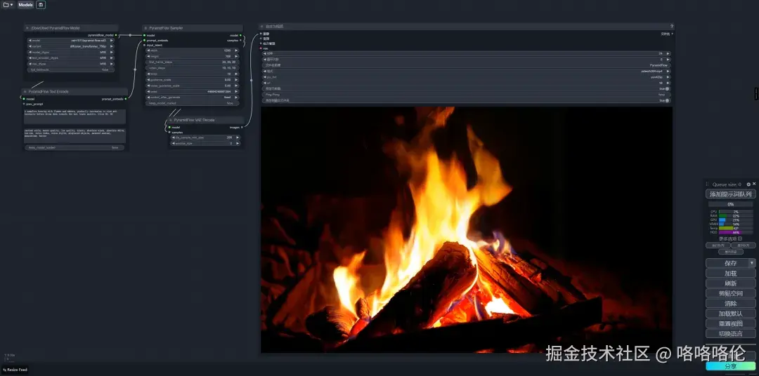 加载工作流:点击右侧的“加载”按钮,将整合包文件夹中的工作流文件加载。目前支持3种工作流,图生视频、文生视频以及文生视频多提示词,大家按需选择即可。
