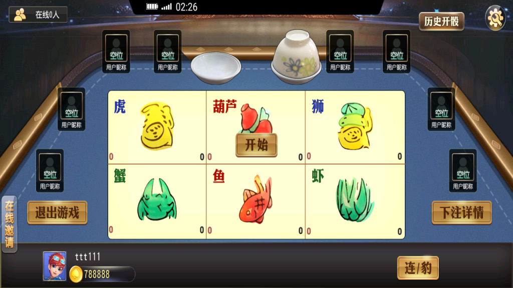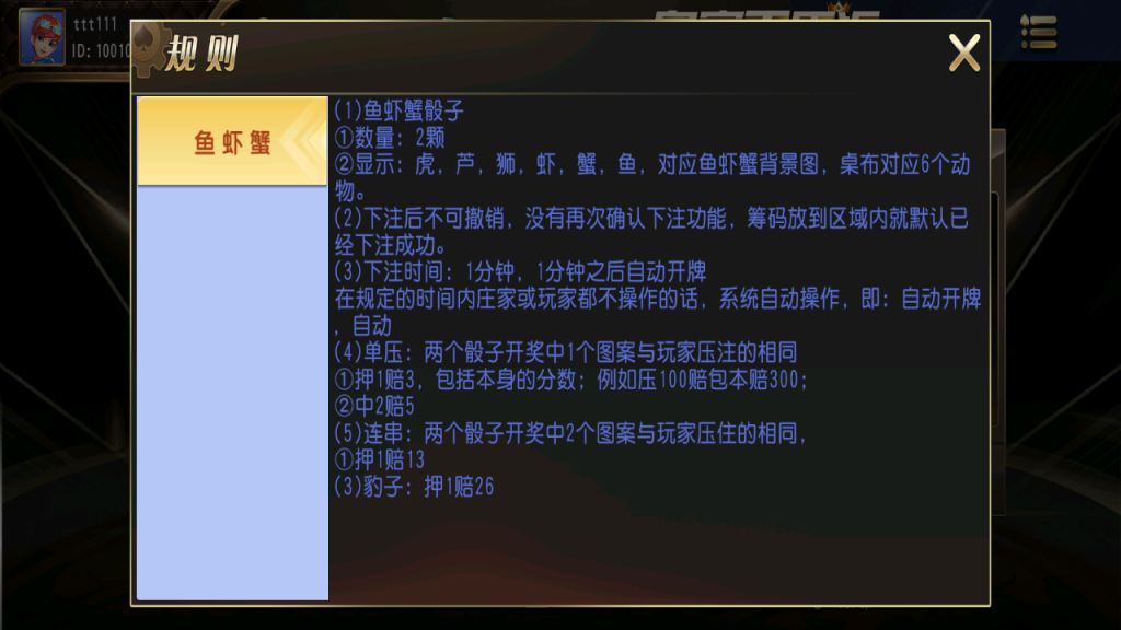 游戏道具:使用一个特别的骰盅,里面有三粒骰子,骰子的六个面分别刻有鱼、虾、蟹、葫芦、金钱、鸡六种图案,且不同图案对应不同颜色和点数,鱼对应红色一点,虾对应绿色二点,蟹对应绿色五点等 。 下注方式:闲家可在多种选项上下注,包括: “大”“小”:三粒骰子平面之点数总和由 4 点至 10 点为 “小”,11 点至 17 点为 “大”。 “三军”:即每粒骰子平面的图案,投中一粒骰子指定平面图案赔一倍,投中两粒骰子指定平面图案相同赔两倍,投中三粒骰子指定平面图案相同赔三倍。 “单色”“双色”“指定三色”“任何三色”:分别指开出结果中只出现一粒、两粒、三粒所投注的颜色等情况,不同情况赔率不同,如指定双色赔率为一赔三倍。 “指定围骰”“任何围骰”:指定围骰指三粒骰子平面图案相同,赔率为一赔一百五十倍;任何围骰指三粒骰子平面的任何图案相同,赔率为一赔二十四倍。 “点数”:由 4 点至 17 点,三粒骰子平面点数的总和,其中 4 及 17 点赔率为一赔五十倍,5 及 16 点赔率为一赔十八倍等。 声明:本站所有文章,如无特殊说明或标注,均为本站原创发布。任何个人或组织,在未征得本站同意时,禁止复制、盗用、采集、发布本站内容到任何网站、书籍等各类媒体平台。如若本站内容侵犯了原著者的合法权益,可联系我们进行处理。